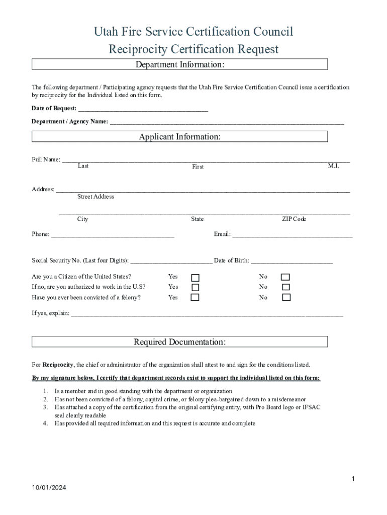 Utah Fire Service Certification Council Reciprocity Certification Request Department Information: The following department / Participating agency requests that the Utah Fire Service Certification