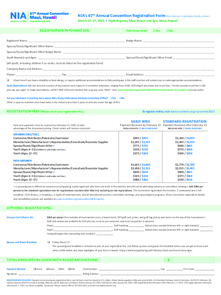 This form is for registering attendees for the NIA’s 67th Annual Convention taking place from March 15 to 17, 2023, at the Hyatt Regency Maui Resort and Spa, Maui, Hawaii. It collects essential information about the registrant, including registration fees, accommodations, and additional activities.