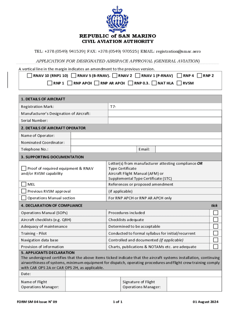 This document is an application for designated airspace approval for general aviation, detailing the necessary information about the aircraft, its operator, supporting documentation, declaration of compliance, and applicant\'s declaration.