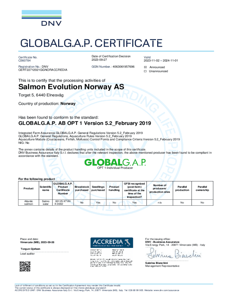 This certificate verifies that Salmon Evolution Norway AS has complied with the GLOBALG.A.P. standards for aquaculture, specifically for Atlantic salmon production. It includes certification details, valid dates, and product handling unit information.