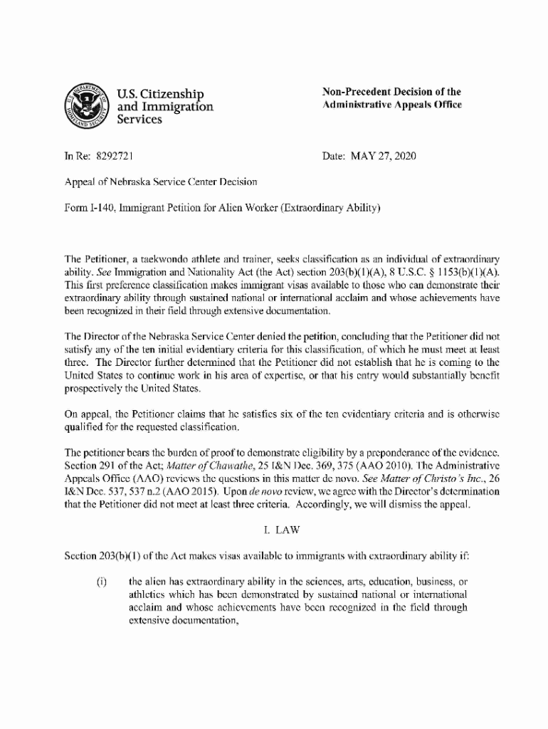 This document outlines the proceedings and decision regarding an appeal for an immigrant petition classified under extraordinary ability for a taekwondo athlete. It details the criteria for classification under the Immigration and Nationality Act, the assessment of the petitioner\'s qualifications, and the reasons for the eventual dismissal of the appeal.