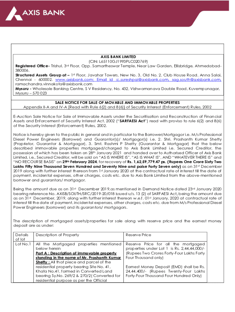 AXIS BANK LIMITED (CIN: L65110GJ1993PLC020769) Registered Office Trishul, 3rd Floor, Opp. Samartheswar Temple, Near Law Garden, Ellisbridge, Ahmedabad380006. Structured Assets Group at 1st Floor,