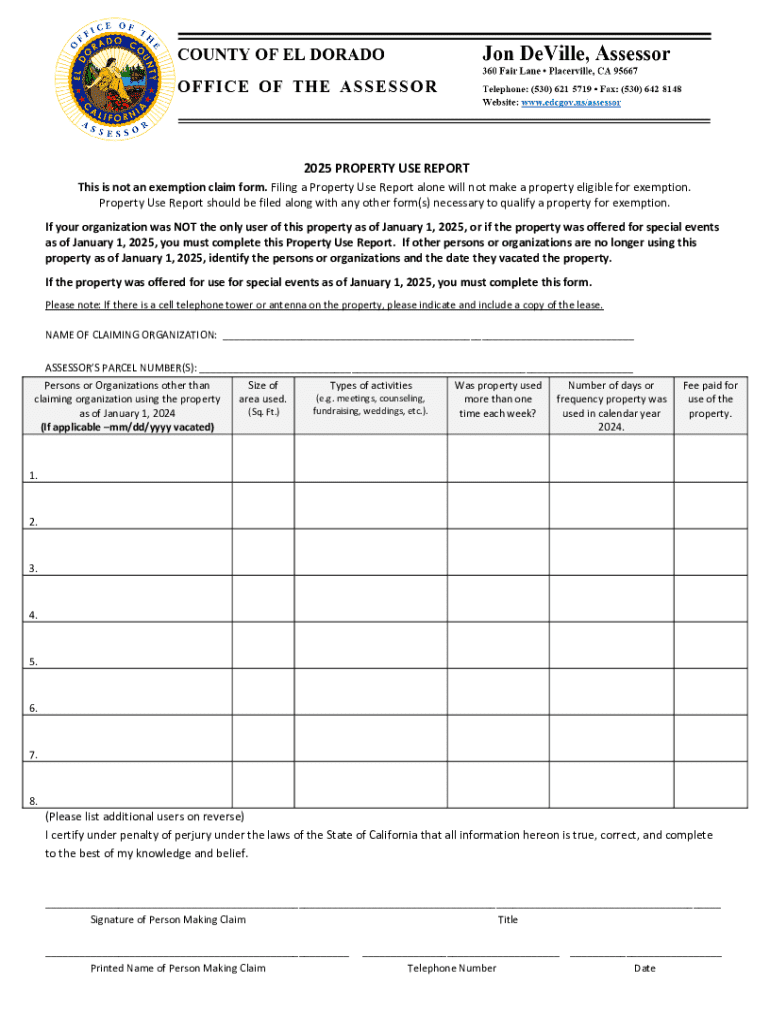 To fill out the 2025 property use report, gather all pertinent information about your property, including its address, current use, tenant information, and any changes from the previous year, then follow the filing instructions provided by your local taxing authority.