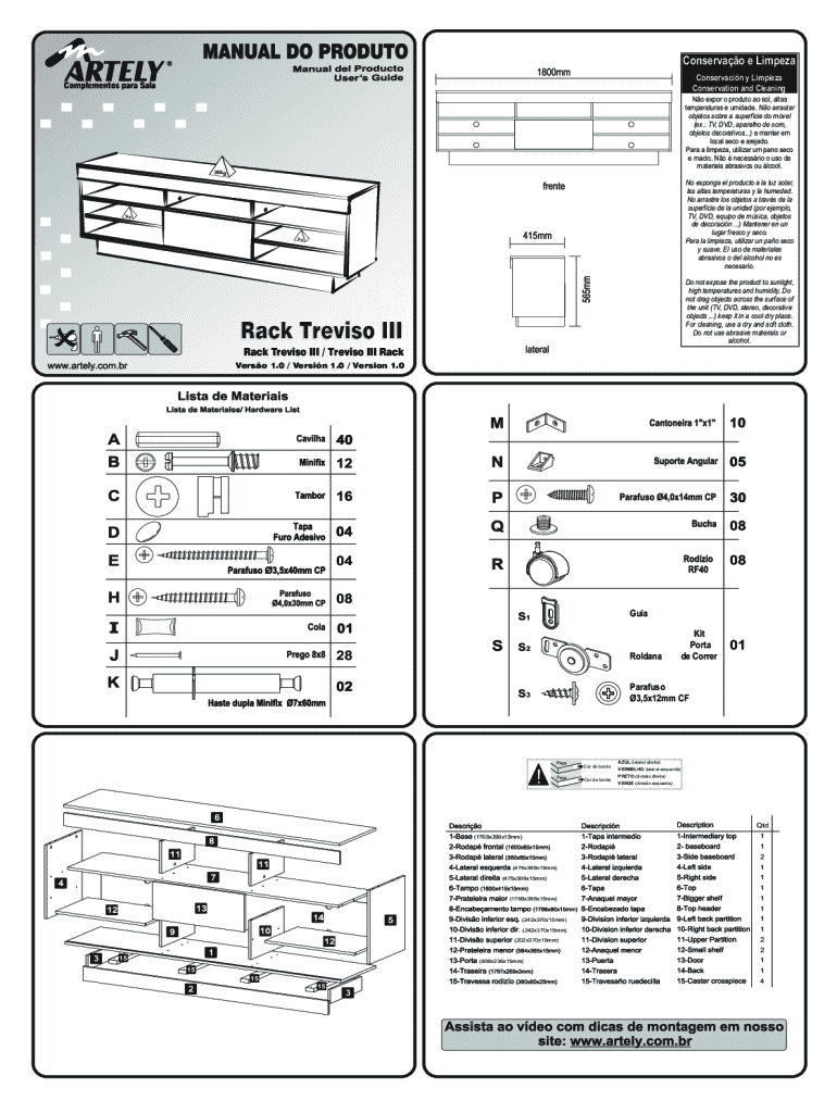 Conservao e Limpeza Conservacin y Limpieza Conservation and Cleaning No expor o produto ao sol, altas temperaturas e umidade. No arrastar objetos sobre a superfcie do mvel (ex.: TV, DVD, aparelho