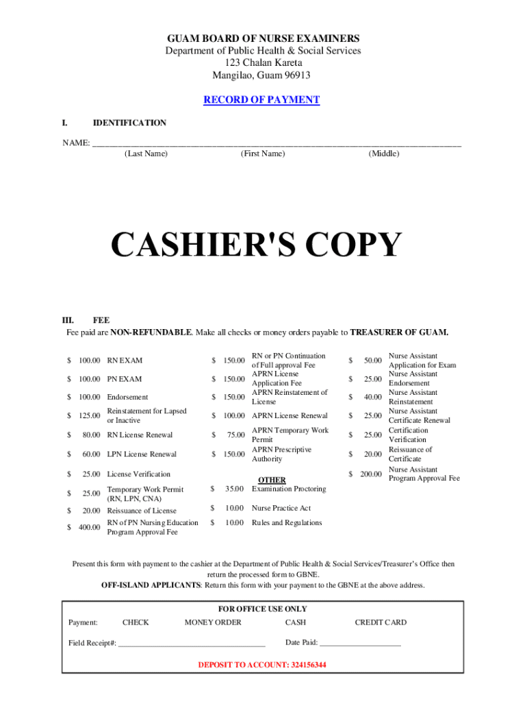 This document serves as a record for payments made to the Guam Board of Nurse Examiners for various nursing examination fees and license-related services. It outlines fees for RN and PN exams, endorsements, reinstatements, and renewals, along with instructions on payment submission.