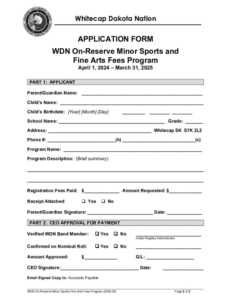 This application form allows Whitecap Dakota Nation members to apply for financial assistance for registration fees related to minor sports and fine arts for children residing on-reserve. It outlines eligibility criteria, the approval process, and instructions for submission.