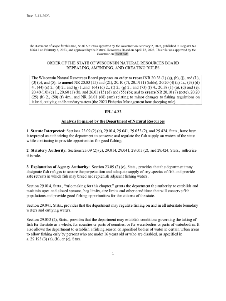 Rev. 2132023The statement of scope for this rule, SS 01523 was approved by the Governor on February 2, 2023, published in Register No. 806A1 on February 6, 2023, and approved by the Natural Resources
