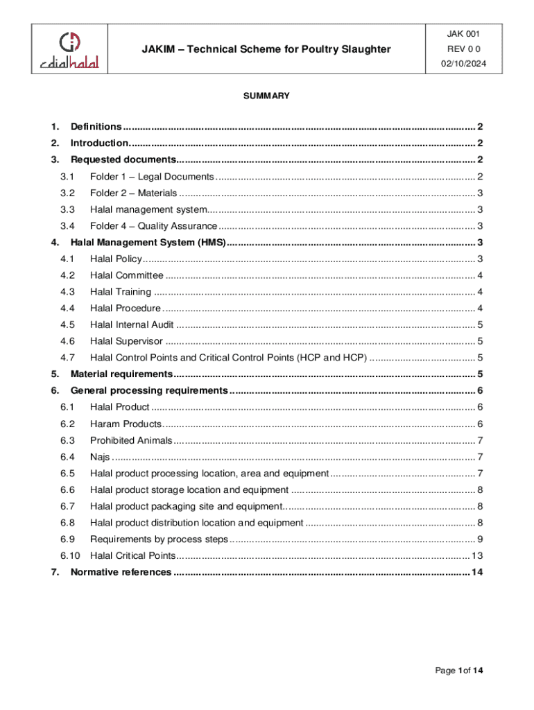 JAK 001JAKIM Technical Scheme for Poultry SlaughterREV 0 0 02/10/2024SUMMARY1.Definitions ..............................................................................................................................