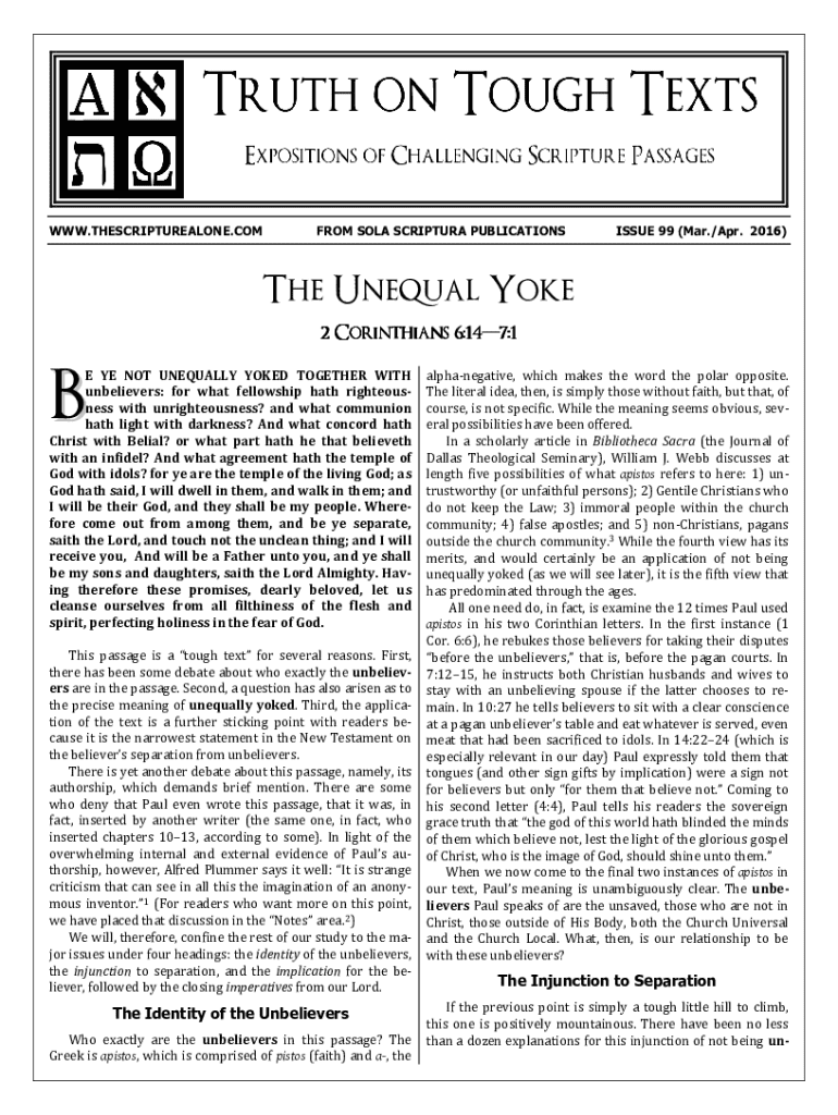 WWW.THESCRIPTUREALONE.COMFROM SOLA SCRIPTURA PUBLICATIONSISSUE 99 (Mar./Apr. 2016)The Unequal Yoke 2 Corinthians 6:14 6:14 :147:1BE YE NOT UNEQUALLY YOKED TOGETHER WITH unbelievers: for what fellowship