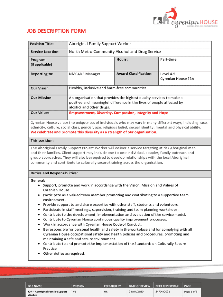 This document outlines the job description for the Aboriginal Family Support Worker position, including the vision, mission, values, duties, responsibilities, and selection criteria for candidates. The role focuses on providing support to at-risk Aboriginal men and their families through various methods, including one-on-one and group outreach.