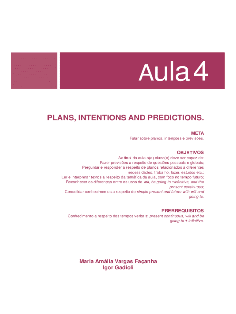 Aula 4 PLANS, INTENTIONS AND PREDICTIONS. META Falar sobre planos, intenes e previses.2%(7,926 $RQDOGDDXODR D DOXQR D GHYHVHUFDSD]GH Fazer previses a respeito de questes pessoais e globais; Perguntar