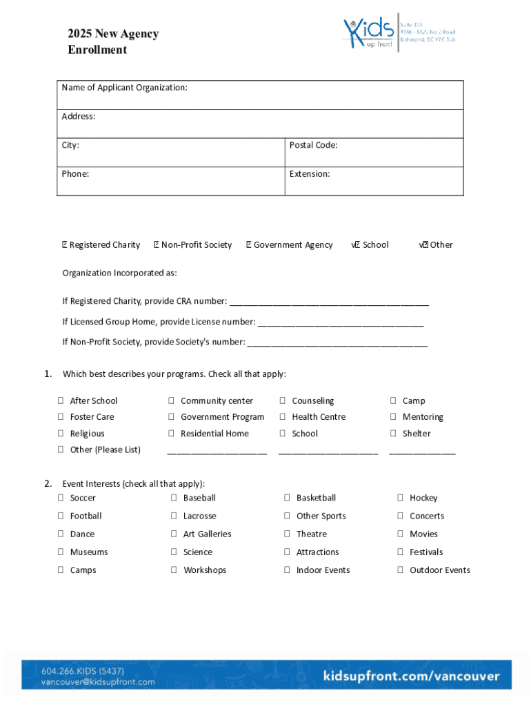 2025 New Agency Enrollment Name of Applicant Organization: Address: City:Postal Code:Phone:Extension:Registered CharityNonProfit SocietyGovernment Agencyv Schoolv OtherOrganization Incorporated as: