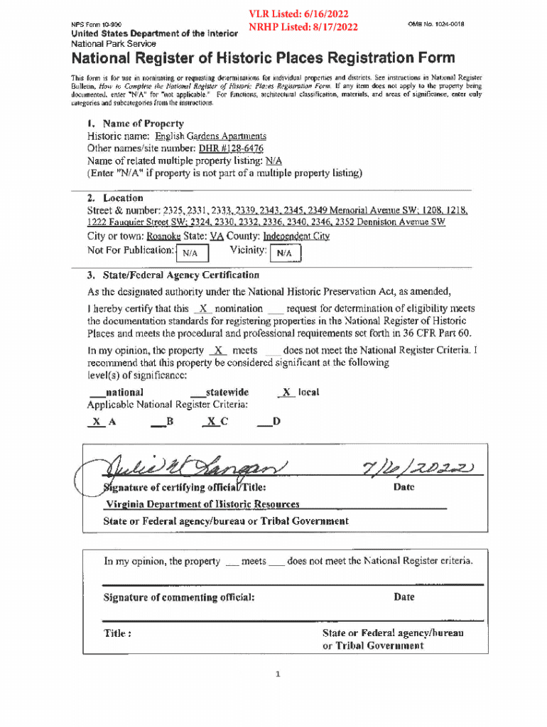 This form is for nominating or requesting determinations for individual properties and districts. It includes details about the English Gardens Apartments, a historic garden apartment complex in Roanoke,