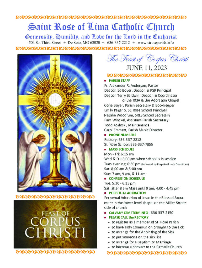 Saint Rose of Lima Catholic Church Generosity, Humility, and Love for the Lord in the Eucharist 504 So. Third Street + De Soto, MO 63020 + 6363372212 + www.stroseparish.infoThe Feast of Corpus Christi