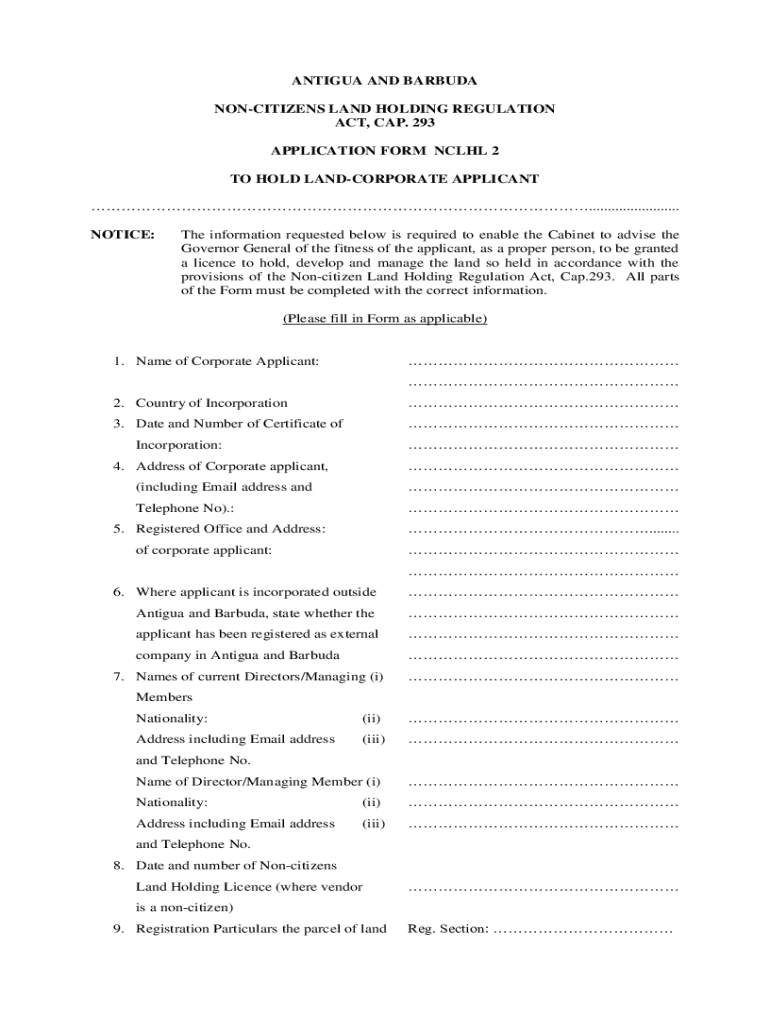 ANTIGUA AND BARBUDA NONCITIZENS LAND HOLDING REGULATION ACT, CAP. 293 APPLICATION FORM NCLHL 2 TO HOLD LANDCORPORATE APPLICANT ........................ NOTICE:The information requested below is required