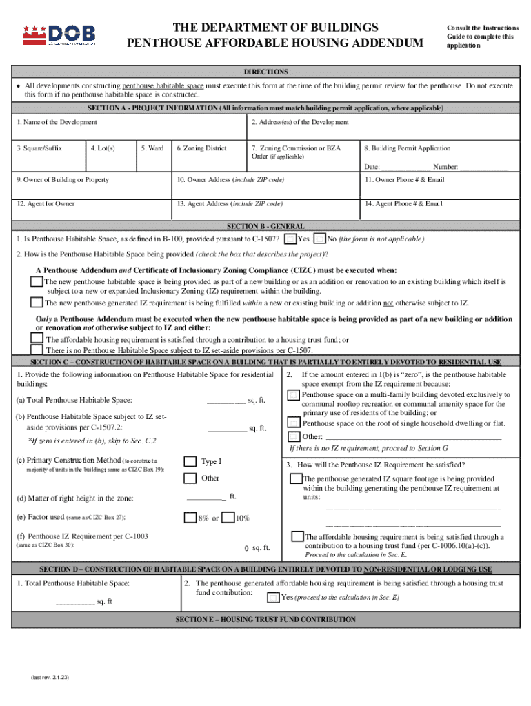 Este formulario debe ser ejecutado por todos los desarrollos que construyan espacio habitable en un penthouse durante la revisión del permiso de construcción. Proporciona información sobre el espacio habitable de penthouse y requisitos de zonificación y contribuciones a fondos de vivienda.