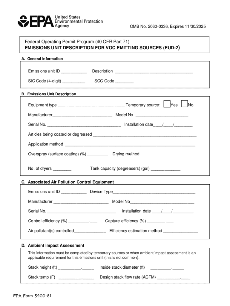 This form is used to describe emissions units that utilize, process, store, or produce substances containing VOC, aimed primarily at those emitting VOC, such as coating operations and printers. It compiles technical data and compliance-related information.