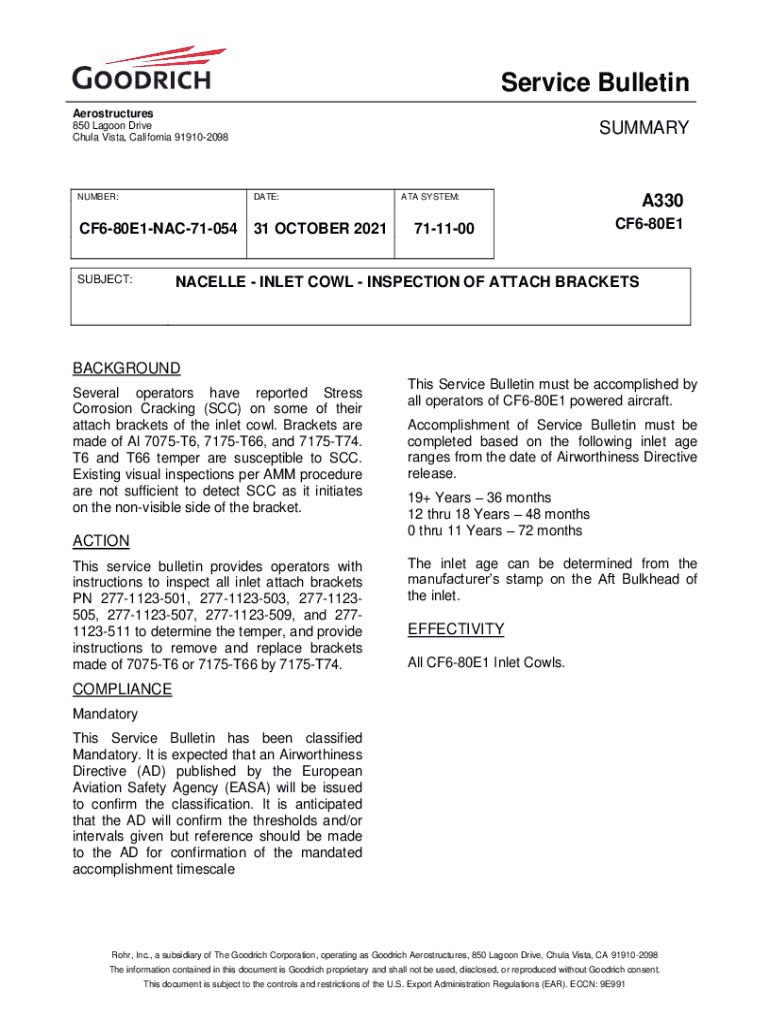 Cette bulletin de service fournit des instructions aux opérateurs pour inspecter tous les supports de fixation de l\'inlet, déterminer leur temper, et fournir des instructions pour retirer et remplacer
