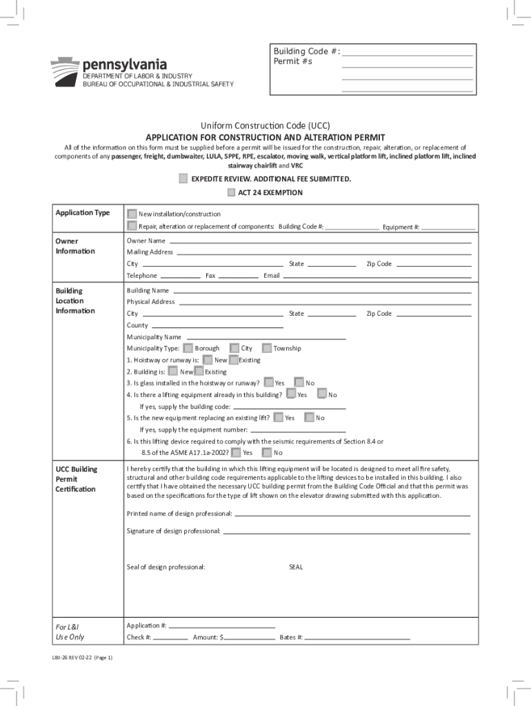 Building Code #: Permit #s DEPARTMENT OF LABOR & INDUSTRY BUREAU OF OCCUPATIONAL & INDUSTRIAL SAFETYUniform Construction Code (UCC) APPLICATION FOR CONSTRUCTION AND ALTERATION PERMITAll of the information