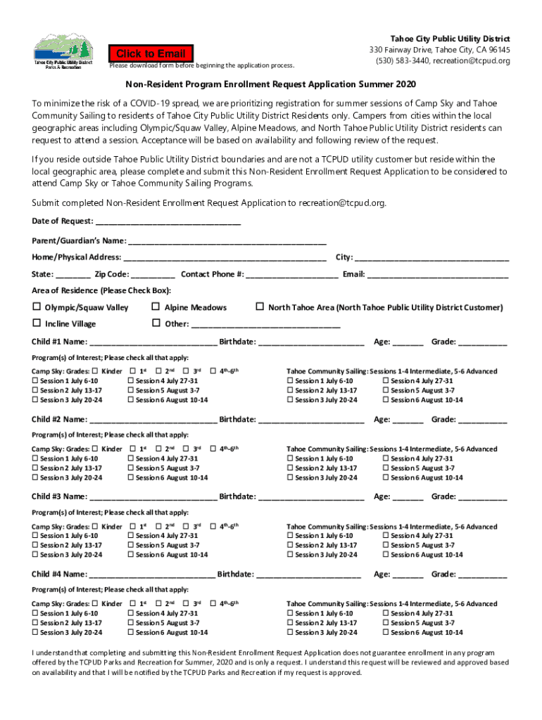 Este formulario es para la solicitud de inscripción de programas de verano, incluyendo Camp Sky y Tahoe Community Sailing, para residentes no pertenecientes al distrito de servicios públicos de Tahoe City. Las solicitudes serán evaluadas en función de la disponibilidad.