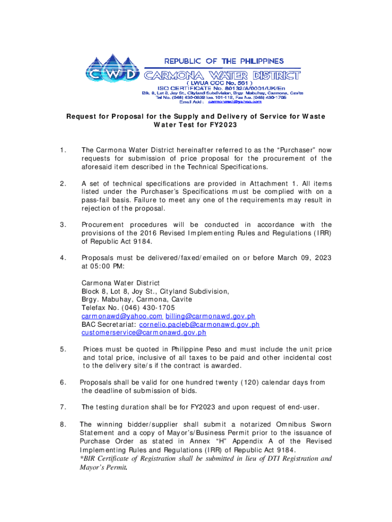 This document serves as a Request for Proposal (RFP) issued by the Carmona Water District for the procurement of waste water testing services for fiscal year 2023, outlining submission requirements, specifications, and terms.
