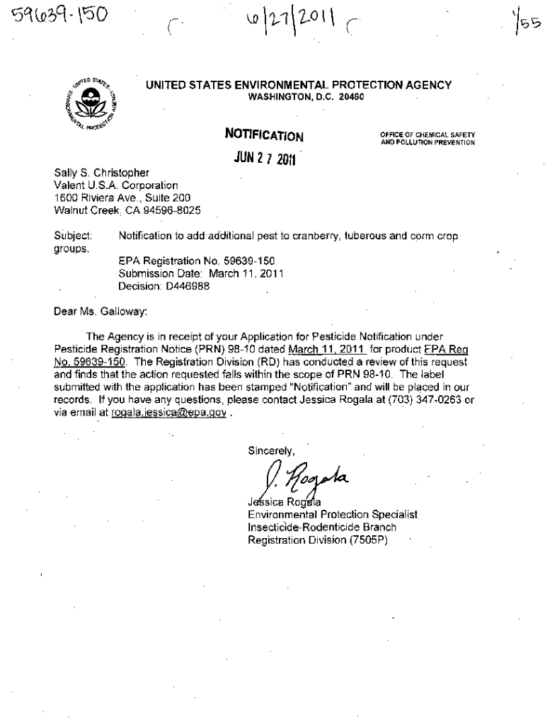 UNITED STATES ENVIRONMENTAL PROTECTION AGENCY WASHINGTON, D.C. 20460NOTIFICAT/OW \'VIMOFFICE OF CHEMICAL SAFETY AMI\"! Dm t I ITIflKI DDCWCMTtnM AND POLLUTION PREVENTIONJUN 2 7 2011 SallyS. Christopher