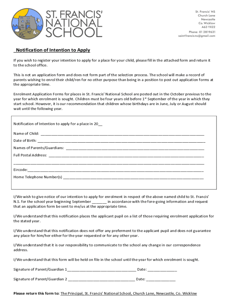 Notification of Intention to Apply If you wish to register your intention to apply for a place for your child, please fill in the attached form and return it to the school office. This is not an application