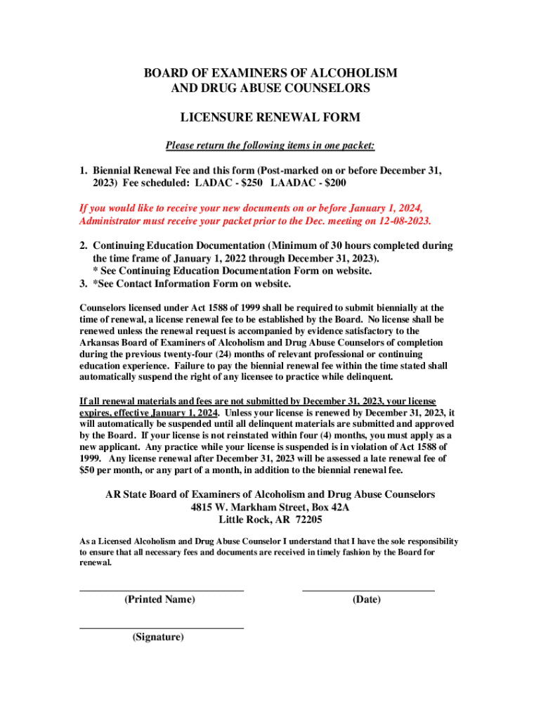 BOARD OF EXAMINERS OF ALCOHOLISM AND DRUG ABUSE COUNSELORS LICENSURE RENEWAL FORM Please return the following items in one packet: 1. Biennial Renewal Fee and this form (Postmarked on or before December