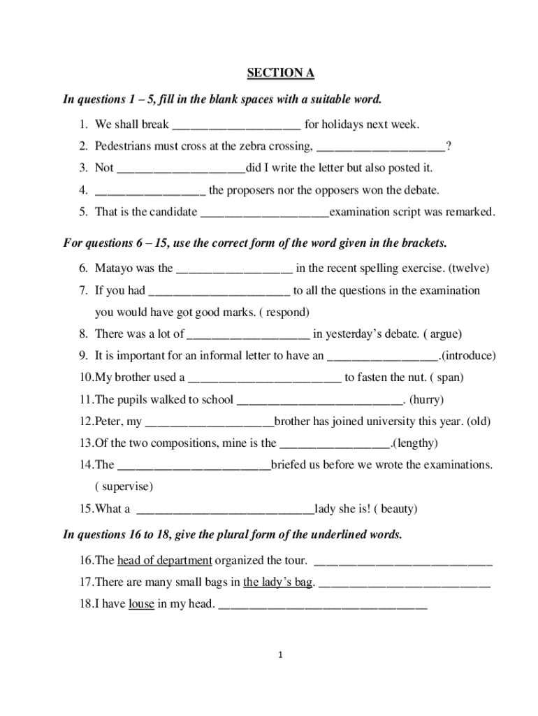 SECTION A In questions 1 5, fill in the blank spaces with a suitable word. 1. We shall break ___ for holidays next week. 2. Pedestrians must cross at the zebra crossing, ___? 3. Not ___did I write