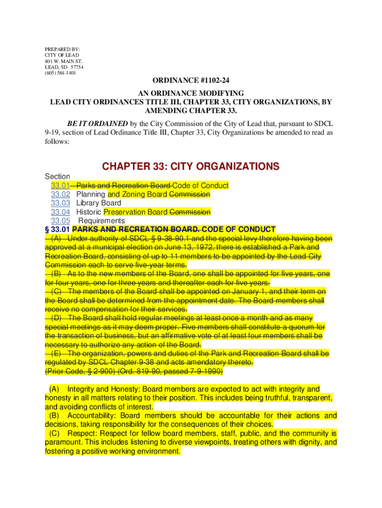 PREPARED BY: CITY OF LEAD 801 W. MAIN ST. LEAD, SD 57754 (605) 5841401ORDINANCE #110224 AN ORDINANCE MODIFYING LEAD CITY ORDINANCES TITLE III, CHAPTER 33, CITY ORGANIZATIONS, BY AMENDING CHAPTER 33.
