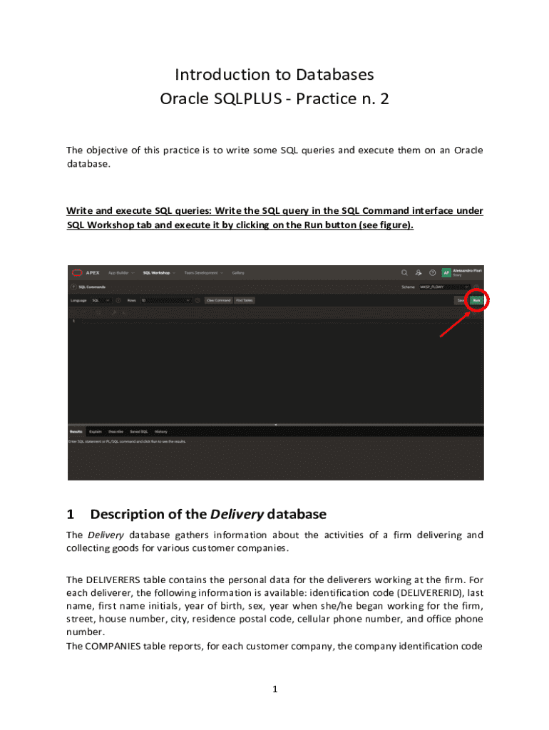 Introduction to Databases Oracle SQLPLUS Practice n. 2 The objective of this practice is to write some SQL queries and execute them on an Oracle database.Write and execute SQL queries: Write the SQL