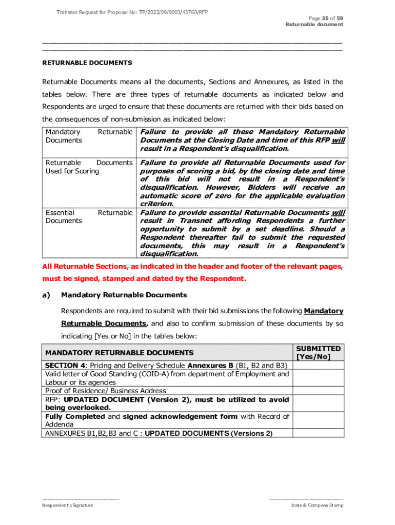 This document outlines the requirements for submitting returnable documents as part of the Transnet Request for Proposal process. It specifies the types of documents needed, the implications of failing to submit required documents, and the necessary steps to be followed by respondents.