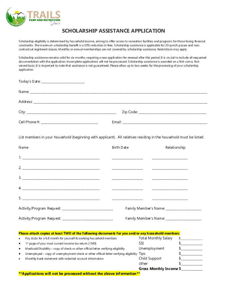 SCHOLARSHIP ASSISTANCE APPLICATION Scholarship eligibility is determined by household income, aiming to offer access to recreation facilities and programs for those facing financial constraints. The