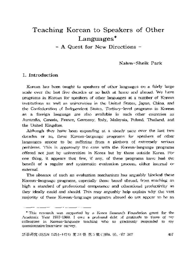 Teaching Korean to Speakers of Other Languages* A Quest for New Directions NahmSheik Park 1. Introduction Korean has been taught to speakers of other languages on a fairly large scale over the last