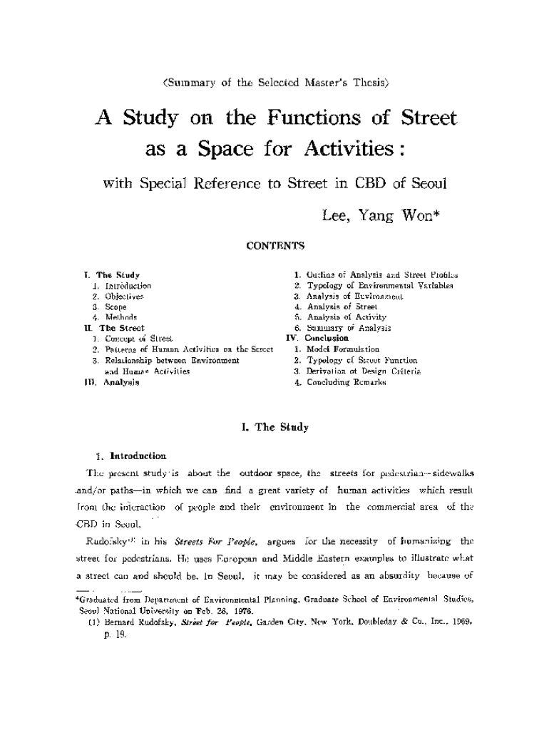 Summary of the Selected Master\'s ThesisA Study on the Functions of Street as a Space for Activities: with Special Reference to Street in CED of Seoul Lee, Yang Won* CONTENTS I. The Study 1. 2. 3.