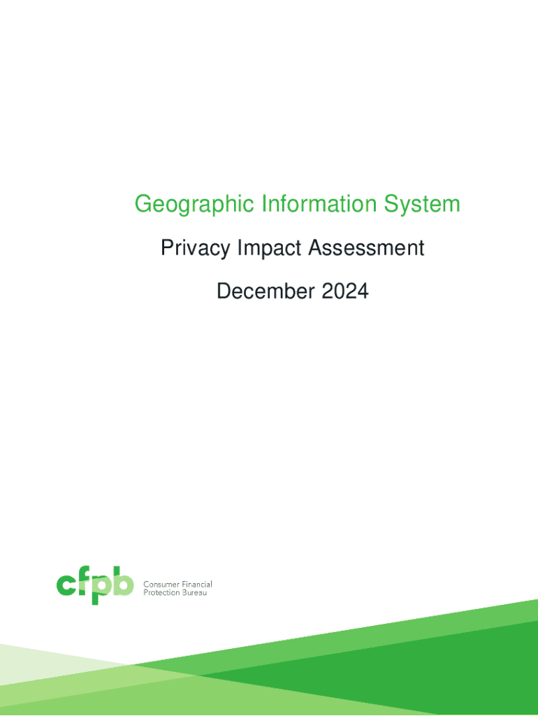 This document provides a comprehensive privacy impact assessment for the Consumer Financial Protection Bureau\'s Geographic Information System (GIS). It outlines the uses, risks, and mitigation strategies associated with the collection and analysis of geospatial data used in various CFPB programs, as well as the technology\'s functionalities and data management procedures.