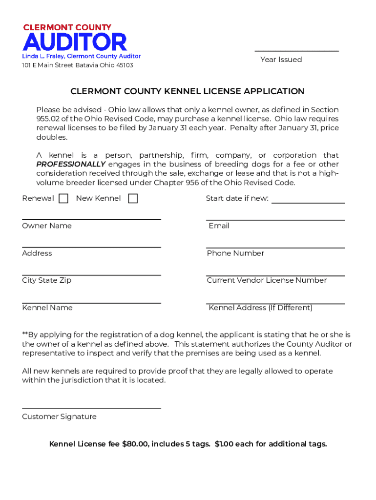 This document serves as an application for a kennel license in Clermont County, Ohio, allowing kennel owners to legally register their kennel for breeding dogs. It includes necessary details for both new and renewal applications, as well as information about fees and requirements mandated by Ohio law.