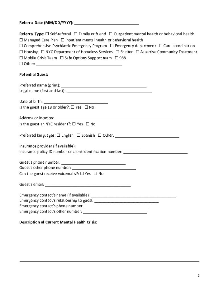 Este formulario se utiliza para referir a personas que experimentan una crisis de salud mental en Nueva York, donde pueden recibir apoyo en un entorno de hogar temporal. Los programas ofrecen estancias de hasta 28 días con acceso a soporte 24/7 y están destinados a personas que no están en riesgo inminente de hacerse daño.