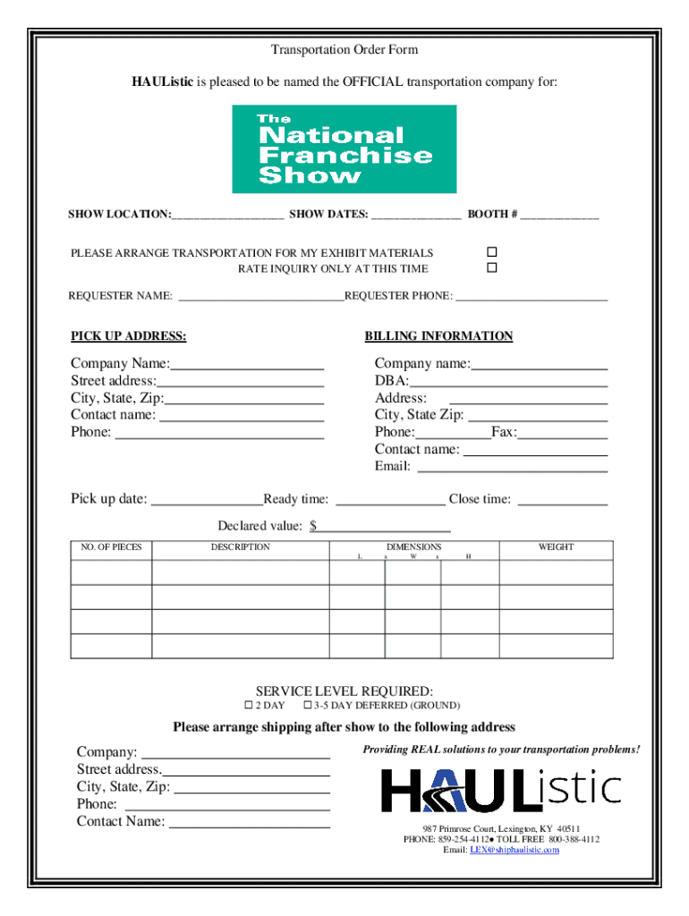 Get the free Transportation Order Form