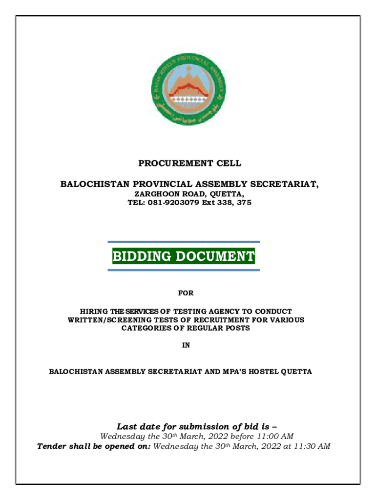 This document provides the bidding process for hiring a testing agency to conduct written/screening tests for recruitment to various regular posts in the Balochistan Assembly Secretariat and MPA\'s Hostel in Quetta. It includes terms and conditions, procedure for submission and opening of bids, eligibility criteria, evaluation criteria, and templates for various forms required for the bidding process.