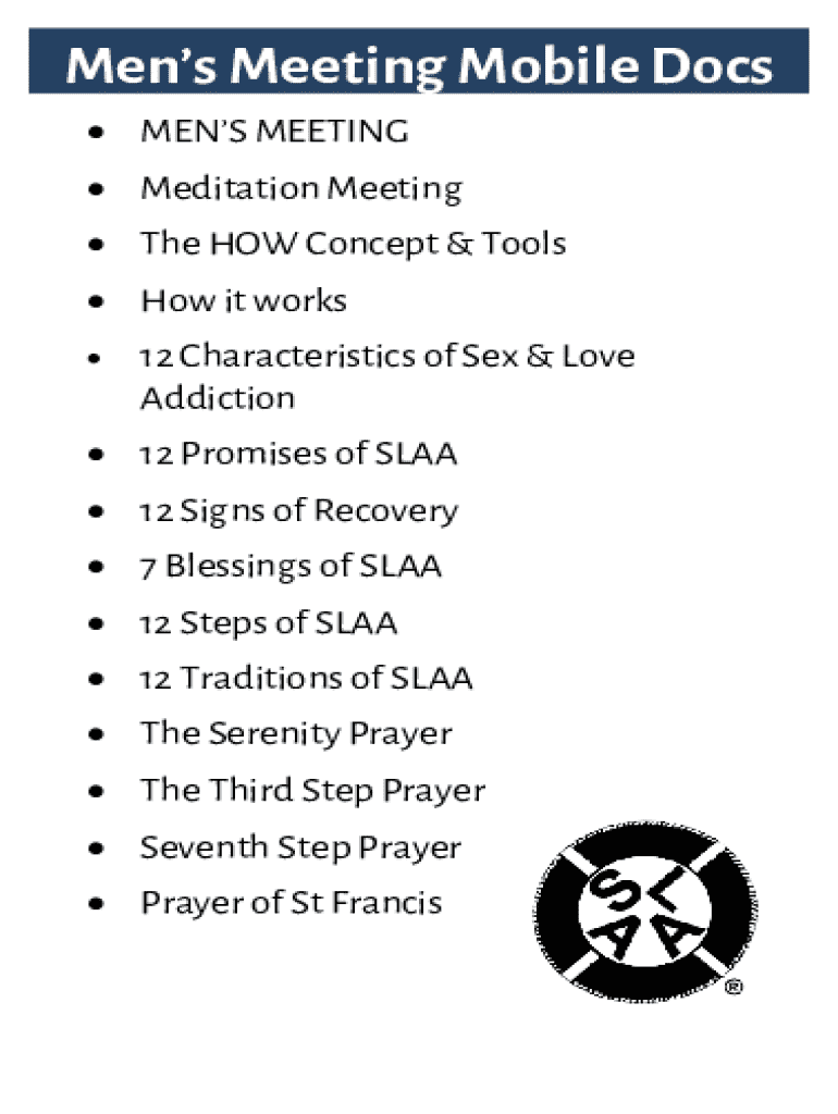 Mens Meeting Mobile Docs MENS MEETING Meditation Meeting The HOW Concept & Tools How it works 12 Characteristics of Sex & Love Addiction 12 Promises of SLAA 12 Signs of Recovery 7 Blessings of SLAA