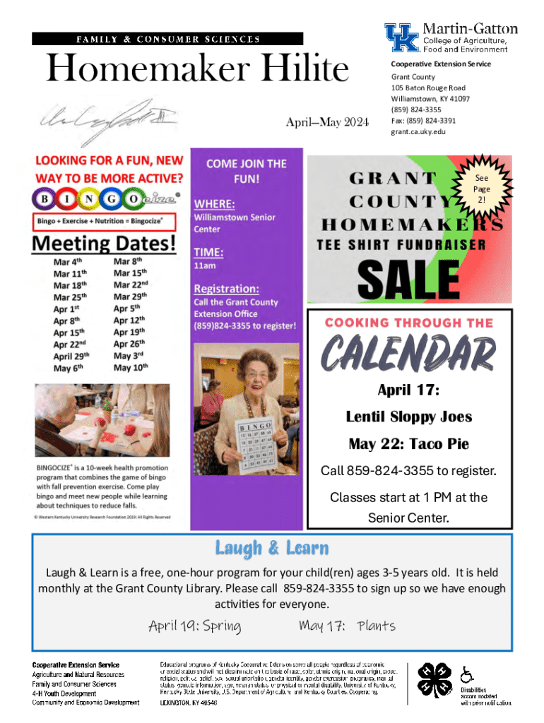 Homemaker Hilite AprilMay 2024Cooperative Extension Service Grant County 105 Baton Rouge Road Williamstown, KY 41097 (859) 8243355 Fax: (859) 8243391 grant.ca.uky.eduSee Page 2!April 17: Lentil Sloppy