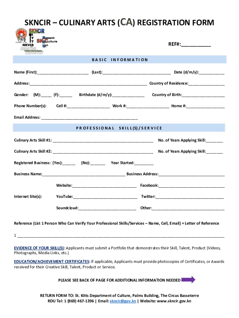 This form is for individuals applying to register their culinary arts skills with the St. Kitts Department of Culture, including personal information, professional skills, evidence of skills, and other necessary documentation.