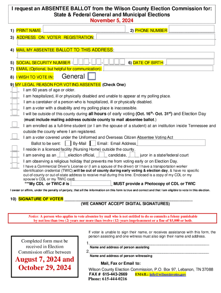 This form is used to request an absentee ballot for state and federal general and municipal elections in Wilson County for the date of November 5, 2024. Voters must provide personal details, legal reasons for voting absentee, and a signature to affirm eligibility.