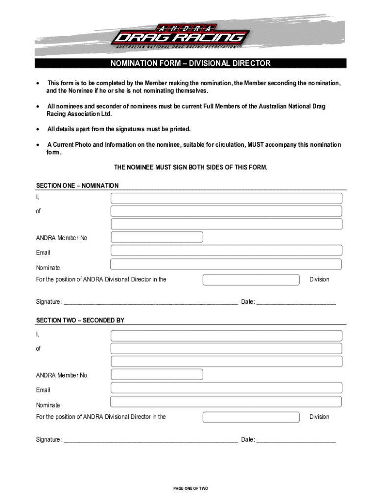 NOMINATION FORM DIVISIONAL DIRECTOR This form is to be completed by the Member making the nomination, the Member seconding the nomination, and the Nominee if he or she is not nominating themselves.All