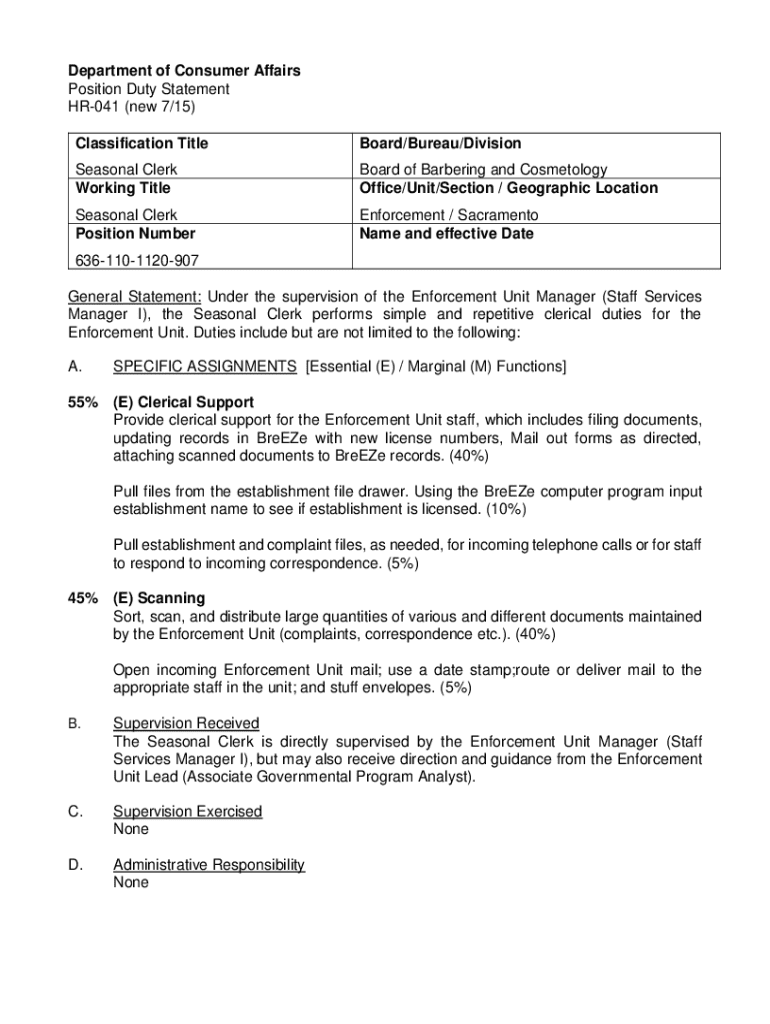 This document outlines the duties and responsibilities of the Seasonal Clerk position within the Enforcement Unit of the Board of Barbering and Cosmetology. It details the specific assignments, supervision received and exercised, personal contacts, actions and consequences, functional requirements, and other necessary information related to the job. The Seasonal Clerk is responsible for providing clerical support, scanning documents, and interacting with both the Board staff and the public.