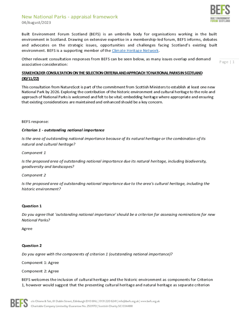 This document outlines the appraisal framework for the selection criteria and approach to new National Parks in Scotland, emphasizing the importance of cultural and natural heritage in the process. It details the criteria for assessment, stakeholder consultations, and the significance of local support and strategic contributions.