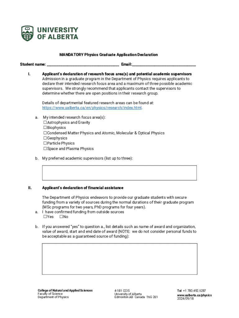 This document is a declaration form for applicants to the graduate program in the Department of Physics at the University of Alberta. It requires applicants to declare their intended research focus areas, potential academic supervisors, and any financial assistance they have confirmed or applied for. The submission of this form certifies the accuracy of the information provided.