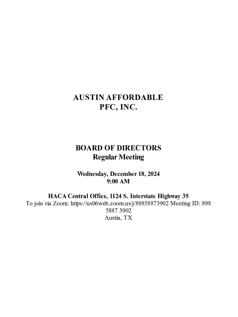 AUSTIN AFFORDABLE PFC, INC.BOARD OF DIRECTORS Regular Meeting Wednesday, December 18, 2024 9:00 AM HACA Central Office, 1124 S. Interstate Highway 35 To join via Zoom: https://us06web.zoom.us/j/89858873902