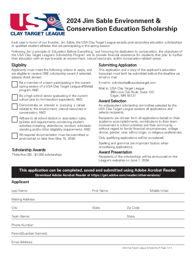An application for the 2024 Jim Sable Environment & Conservation Education Scholarship, awarded to qualified student athletes participating in the USA Clay Target League. The scholarship supports students pursuing education in environment, natural resources, and conservation-related fields.